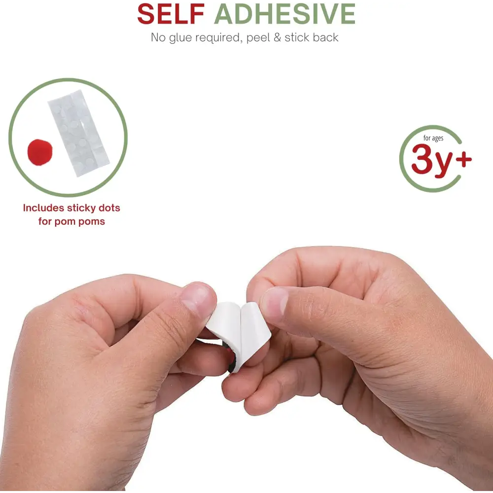 EVERYTHING YOU NEED, NO MESS: Forget messy glue! Most pieces are self-adhesive, so kids can simply stick and go. With pom poms, googly eyes, and hanging cords included, each snowman can have its own unique personality for endless holiday fun.