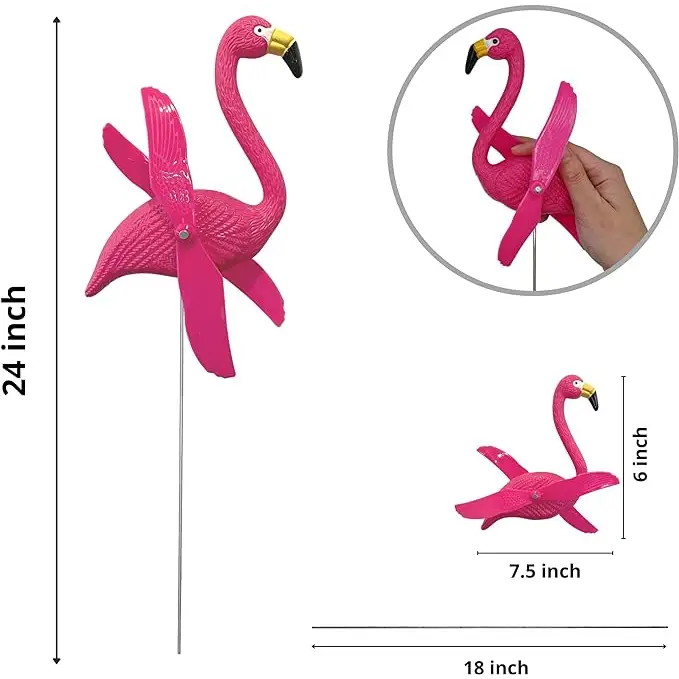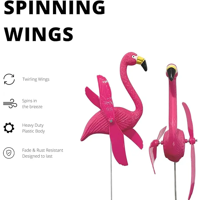 - TWIRLING WINGS IN ACTION: These pink flamingos for yard feature spinning wings that catch the breeze, creating a playful and dynamic display in your garden decor.