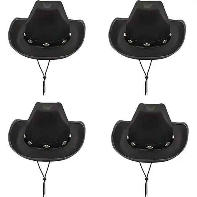 Add a touch of rugged charm to any outfit with our Black Cowboy Hat, a must-have accessory for both men and women. Crafted from premium felt, this versatile cowboy hat offers durability and style in one. Its classic black color and sleek design make it the ideal complement to rodeo outfits, cowgirl looks, or casual western wear. Whether you're preparing for a rodeo, country music festival, or a western-themed party, this hat enhances your ensemble with effortless style. This 4-piece set includes hats suitable for all occasions. The high-quality felt ensures the hat retains its shape even after extended use, while the snug, comfortable fit makes it perfect for all-day wear. Whether you’re at an outdoor festival, country event, or simply looking to add some western flair to your look, this cowboy hat is the ideal accessory. Designed for both men and women, this black cowboy hat features a timeless silhouette that’s perfect for anyone looking to embrace western culture or simply make a bold fashion statement. With its sturdy construction and versatile design, it’s the perfect addition to your wardrobe. Pair it with a chic cowgirl outfit for women or a rugged cowboy look for men, and you’ll be ready for any adventure! Whether you're looking for a cowgirl hat to complete your western-inspired look or a sturdy black cowboy hat for a classic style, this hat is the perfect choice. It also makes a great gift for anyone who loves western fashion or enjoys embracing the spirit of the Wild West. Embrace the legacy of cowboy culture with our Black Cowboy Hat for Men and Women today and stand out with authentic western style!