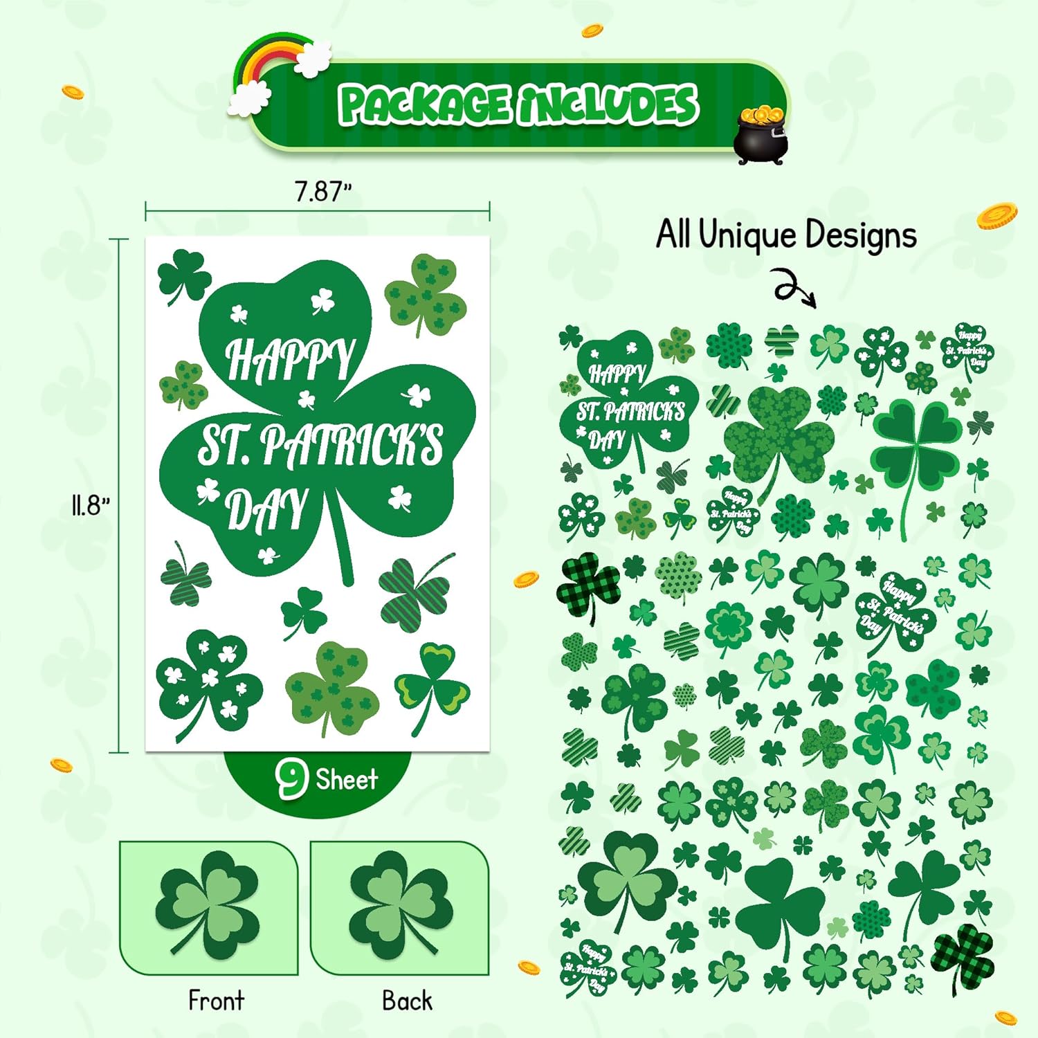 𝐑𝐄𝐔𝐒𝐀𝐁𝐋𝐄 𝐒𝐇𝐀𝐌𝐑𝐎𝐂𝐊 𝐌𝐀𝐆𝐈𝐂 𝐓𝐇𝐀𝐓 𝐒𝐓𝐈𝐂𝐊𝐒 𝐀𝐑𝐎𝐔𝐍𝐃: Dive into the fun with these easy-peel St Patricks Day window stickers! Made from premium PVC static film, our shamrock clings are super sticky on clean surfaces