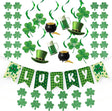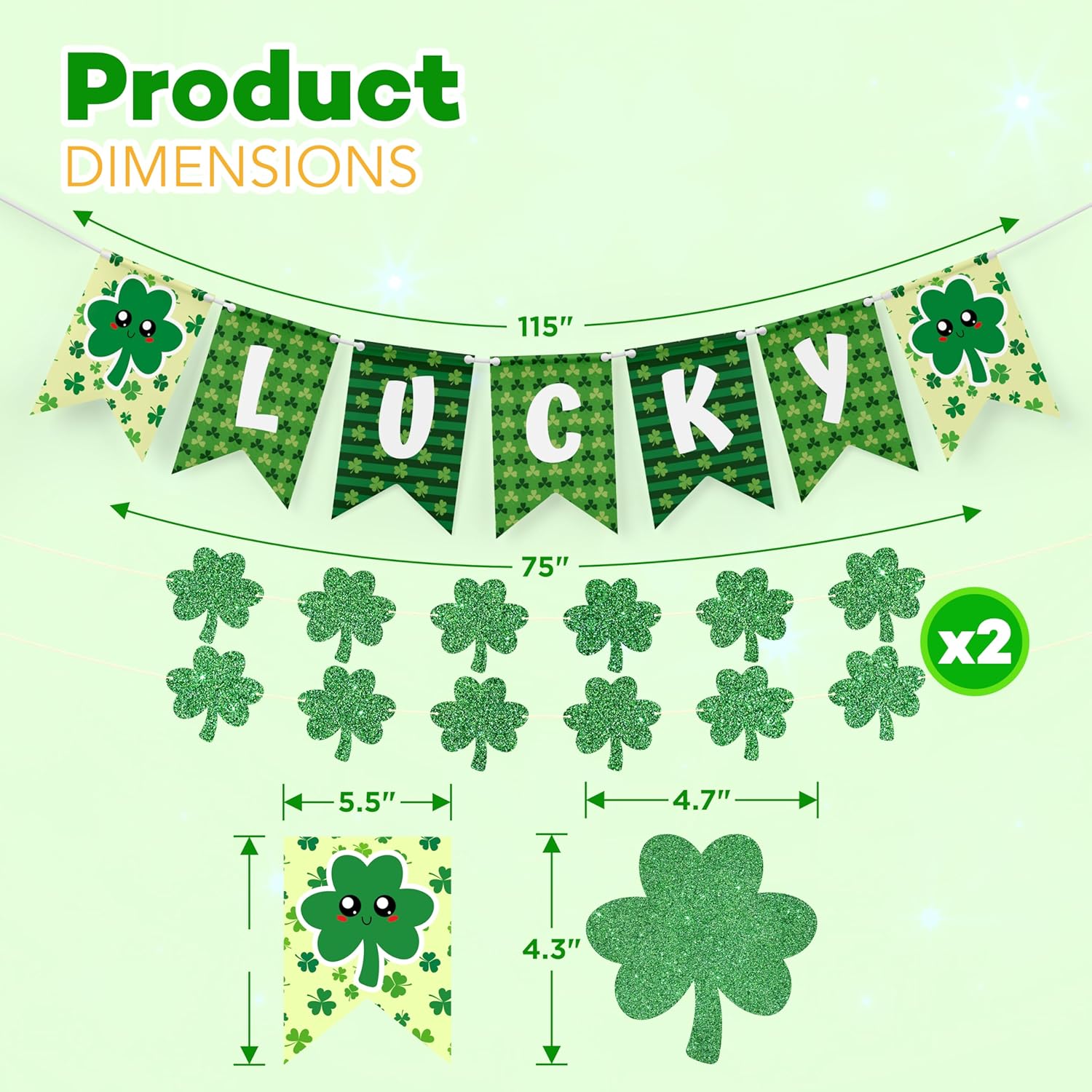 Get ready to chase rainbows and unleash the luck with 4E's Novelty 19 Piece St. Patrick's Day Decorations Kit! This super fun bundle packs vibrant green cardstock magic: 1 bold LUCKY banner, 6 flowing shamrock garlands, and 12 dazzling hanging swirls with 12 double-sided cutouts. Shamrock garlands designed for quick, easy hanging, just pop them up on ceilings, walls, doors, or mantels
