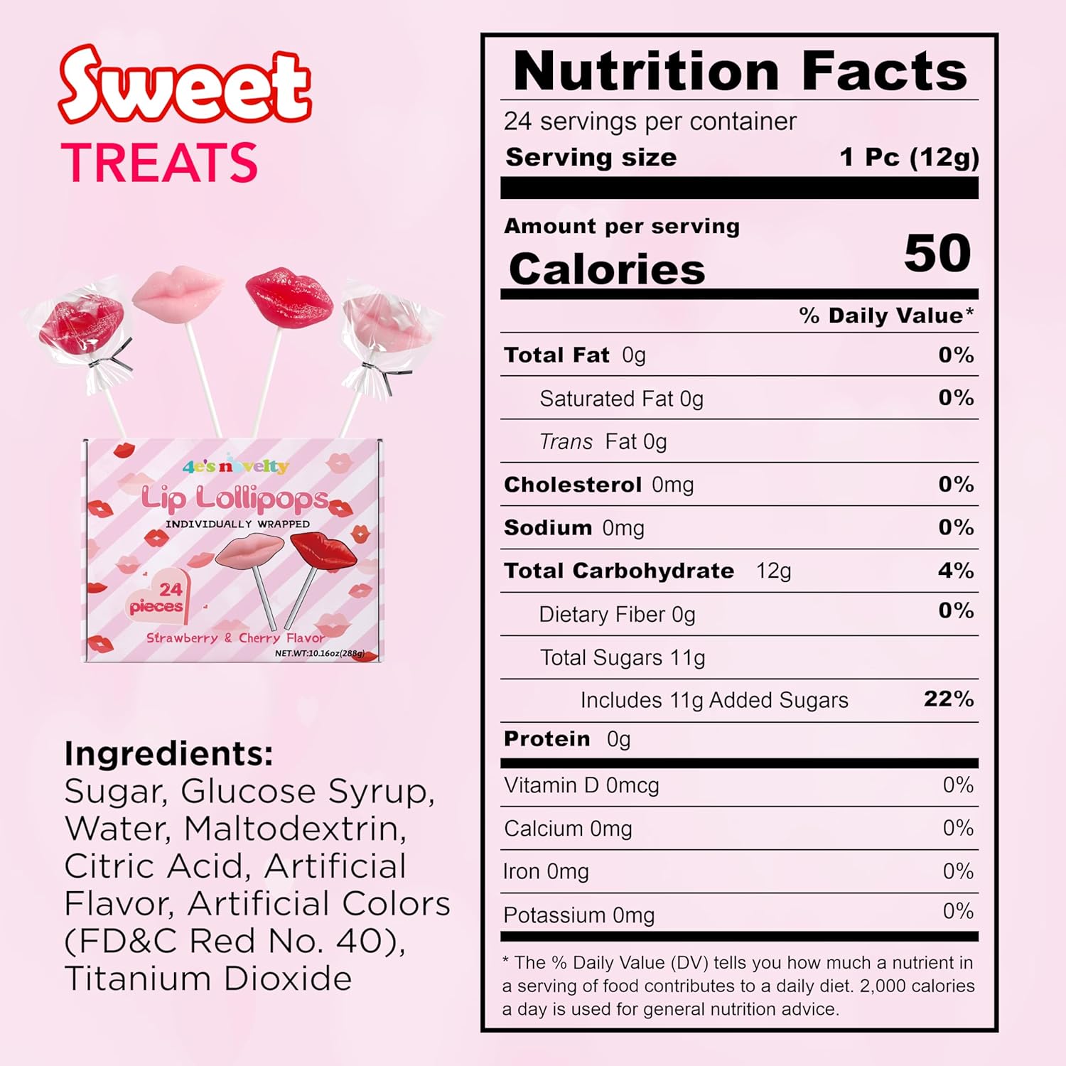𝐋𝐈𝐏-𝐒𝐌𝐀𝐂𝐊𝐈𝐍𝐆 𝐅𝐔𝐍 𝐈𝐍 𝐄𝐕𝐄𝐑𝐘 𝐏𝐀𝐂𝐊: Get 24 bold yummy lips lollipop treats bursting with juicy strawberry flavor! Each 12g lip shaped candy is individually wrapped for freshness and ready for valentines lollipops, classroom parties, or lunchbox surprises. The playful lips candy shape brings instant smiles. No sticky mess, just pure fruity joy in every valentines lollipops individually wrapped piece.