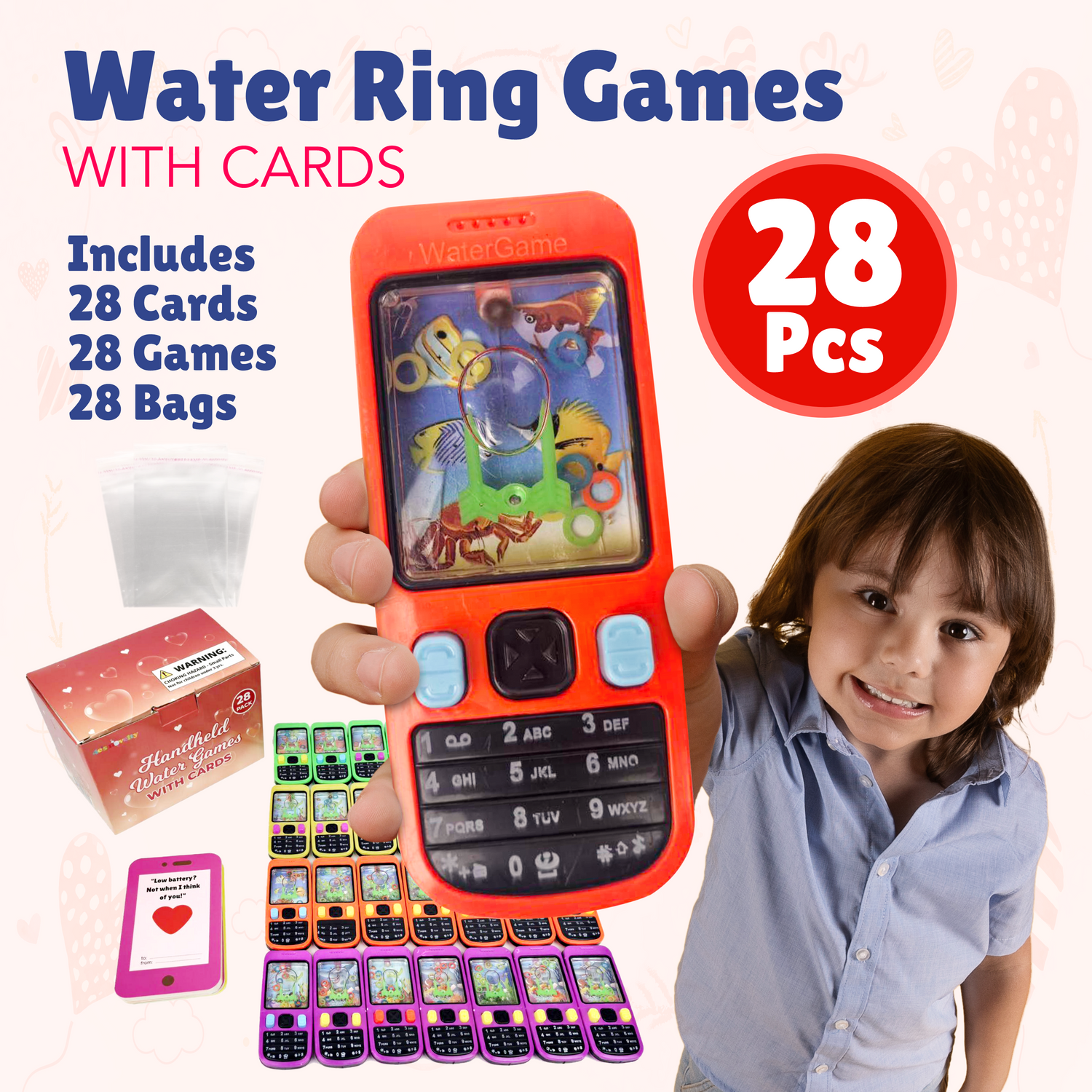 The 4E's Novelty 28 pack offers handheld water games for kids alongside cards and bags for organized distributions. Each Valentines Gifts for Classroom Exchange measures 4.2 by 1.8 inches in plastic. Box packaging keeps the set intact for transport to events where water ring toss handheld game applies.