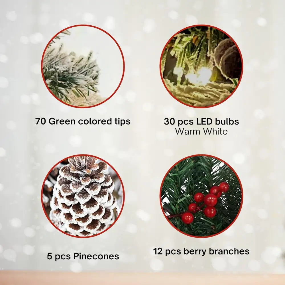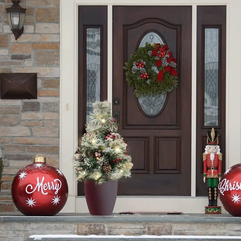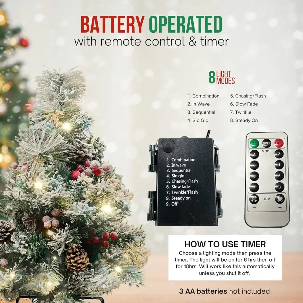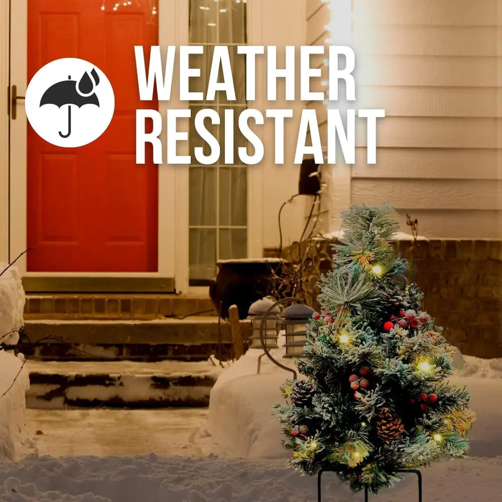 Turn your home into a festive retreat with this 30" Prelit Outdoor Mini Christmas Tree. Whether flanking your front door, lining a walkway, or brightening a patio, this compact artificial Christmas tree adds an instant holiday glow with its snow-frosted branches and warm white lights. With 30 LED bulbs and 8 twinkling modes, you can customize your holiday display to suit any mood. Unlike traditional plug-in decor, this battery-operated Christmas tree offers the freedom to decorate anywhere, hassle-free. A convenient remote control and built-in timer make operation effortless—set it once and enjoy a beautifully lit display every evening. Crafted from weather-resistant materials, this mini lighted Christmas tree is built to withstand winter's chill, and its sturdy 6-inch metal stakes keep it securely in place, even in strong winds. Perfect as an outdoor porch Christmas tree or as charming prelit pathway trees, this small but mighty decoration is packed with holiday spirit. Whether enhancing your holiday entryway or adding sparkle to planters, this prelit battery-operated Christmas tree is the ultimate festive accent. Bring joy, warmth, and elegance to your home this season—click "Add to Cart" now and make your holidays shine!