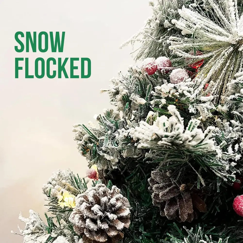 SNOWY CHARM: This prelit outdoor Christmas tree features snow-frosted branches, bringing a winter wonderland feel to your porch, yard, or pathway.