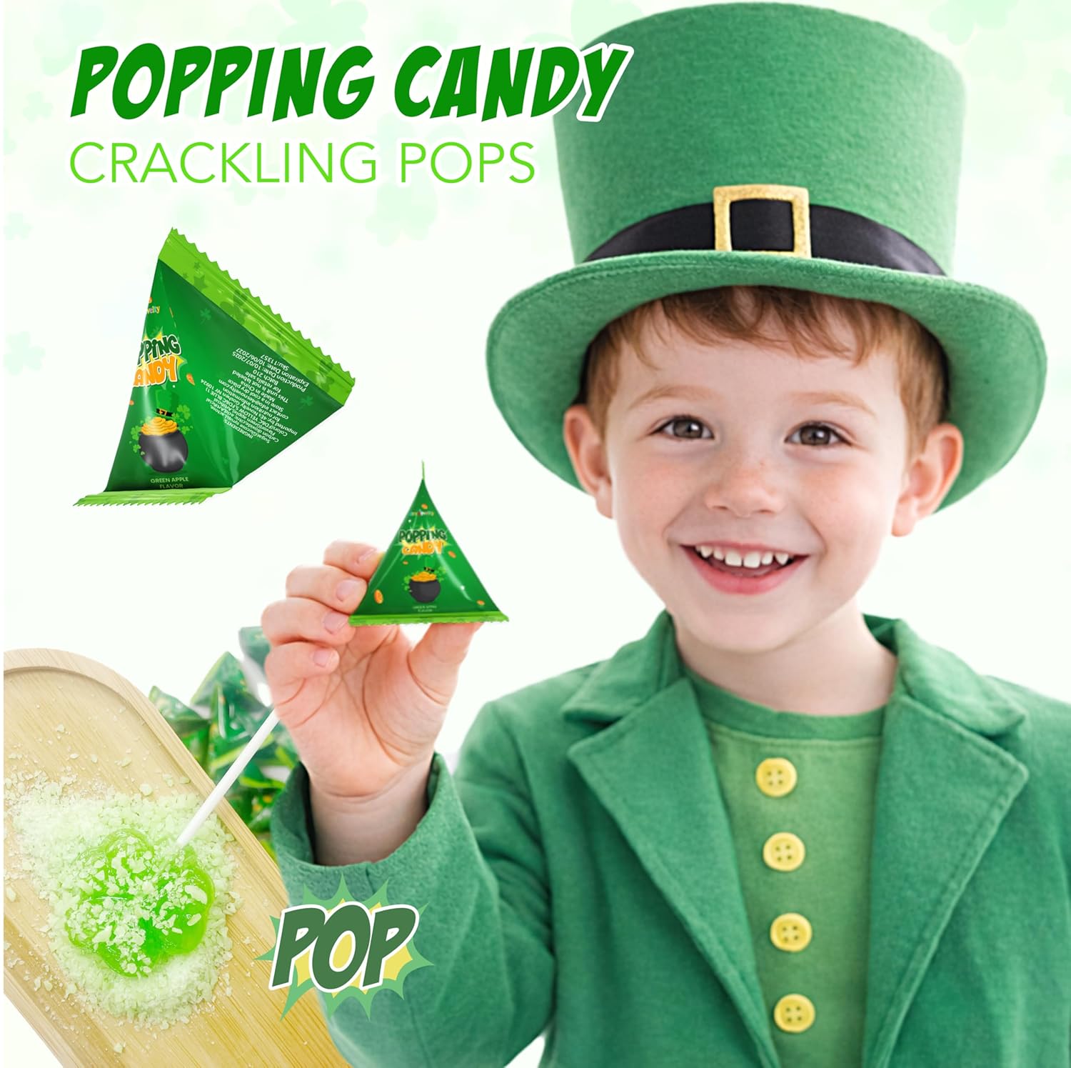 𝐄𝐗𝐏𝐋𝐎𝐒𝐈𝐕𝐄 𝐆𝐑𝐄𝐄𝐍 𝐀𝐏𝐏𝐋𝐄 𝐏𝐎𝐏𝐏𝐈𝐍𝐆 𝐂𝐀𝐍𝐃𝐘 𝐅𝐔𝐋𝐋 𝐎𝐅 𝐒𝐓. 𝐏𝐀𝐓𝐑𝐈𝐂𝐊'𝐒 𝐃𝐀𝐘 𝐓𝐇𝐑𝐈𝐋𝐋𝐒: Cheer up the celebration with 4E's Novelty vibrant green popping candy packets that unleash a tangy green apple flavor explosion combined with wild crackling pops.