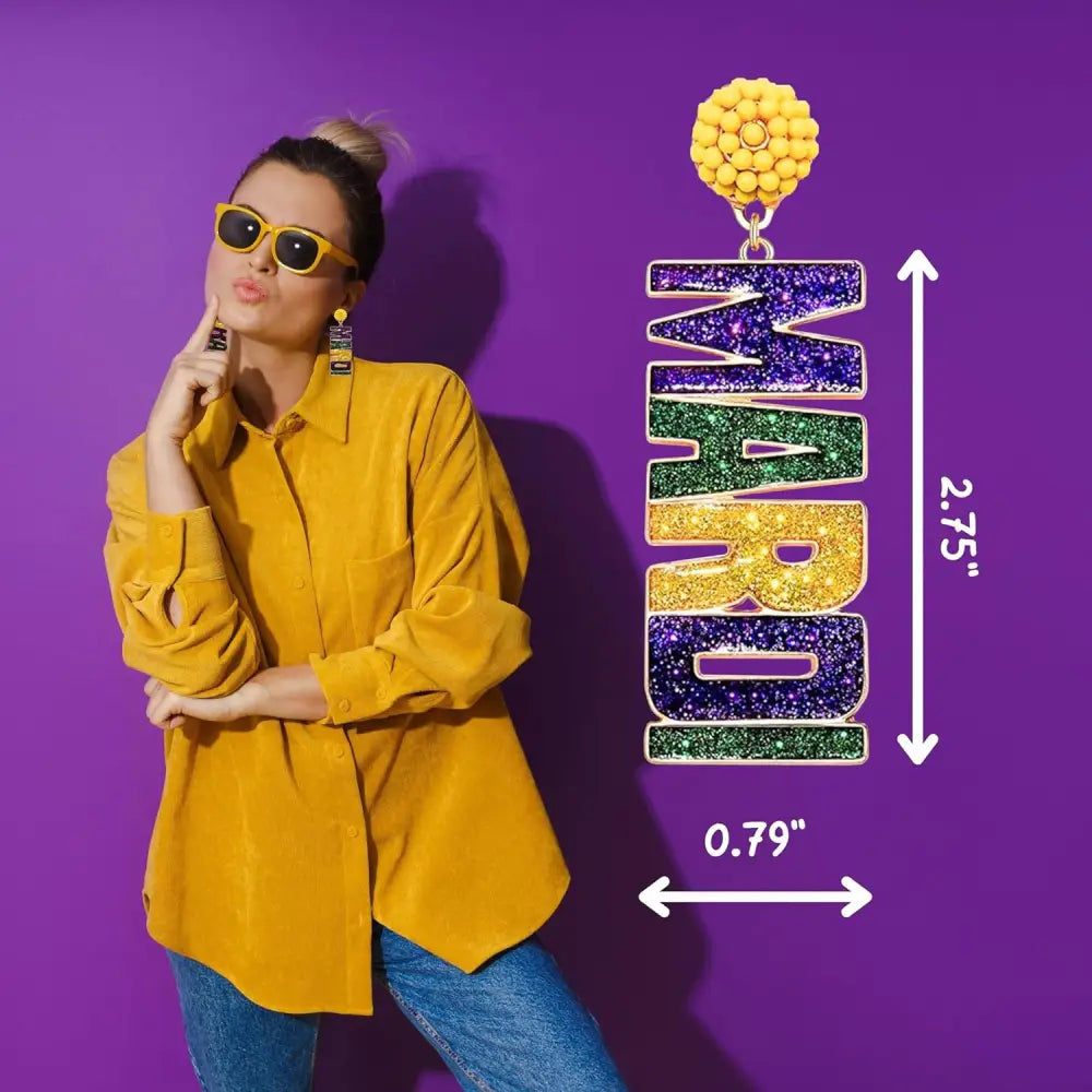 BOLD & FESTIVE STATEMENT: Featuring ‘MARDI GRAS’ lettering with sparkling accents, these earrings add glamour to any parade, party, or festival outfit.