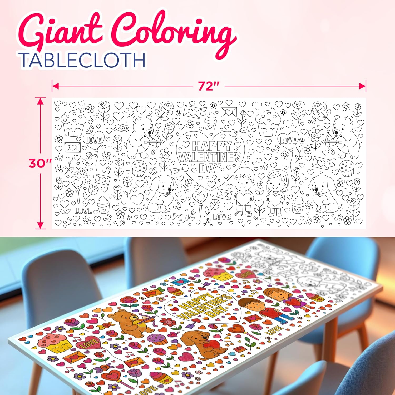 Ideal for classrooms, parties, playdates, or home activities, this Valentine coloring tablecloth also protects surfaces while keeping kids entertained for hours. Use it as a table cover, wall poster, floor activity mat, or party backdrop. Made from paper material and designed for easy use, it is a versatile Valentine’s Day activity that combines crafts, games, and decorations into one memorable experience for kids of all ages.